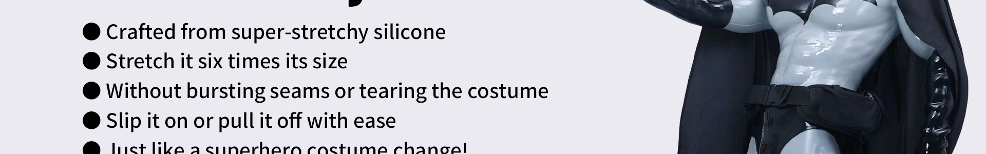 Excellent silicone quality. Both the muscle suit and briefs fit snugly without feeling tight. The gloves are super glossy and look amazing in photos